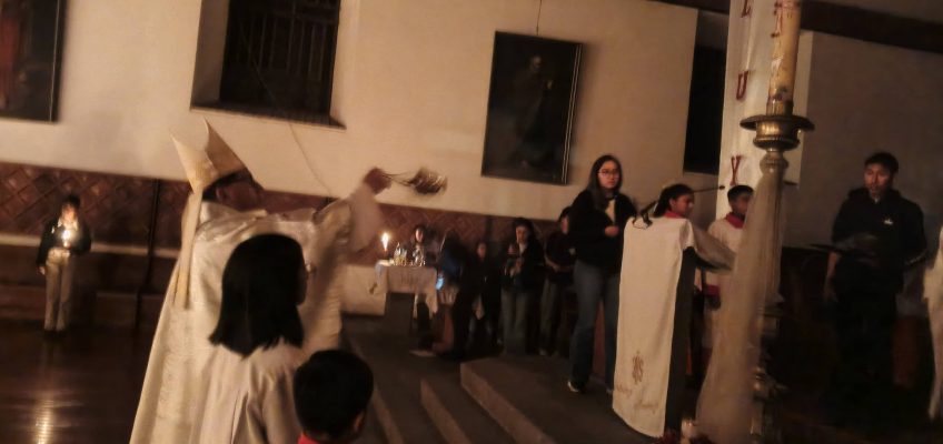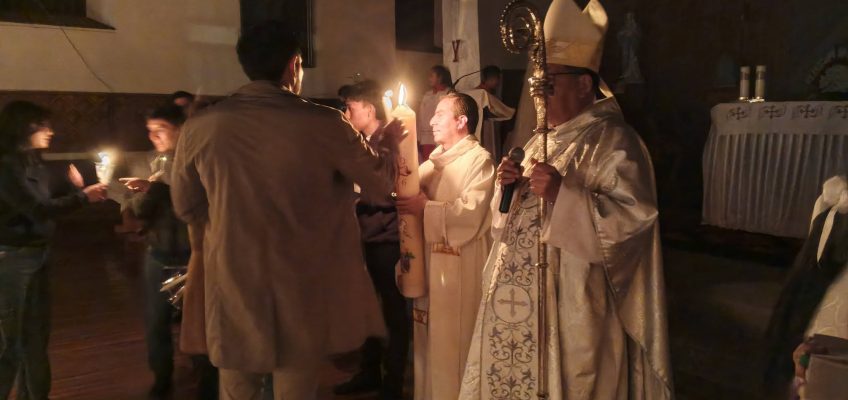 Hace pocos instantes se realizó la Eucaristía de Pascua de Resurrección en la Catedral de Riobamba, se bendijo ,el agua, el fuego,dónde se lo tomó para encender el Cirio Pascual,que representa a Cristo resucitado.